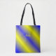 Este bolsa clássico adiciona estilo às suas necessidades diárias. As listras azuis, amarelas-douradas são criadas de uma forma artística única. Você pode colocar um monograma, um nome ou um ditado em qualquer lugar nesta bolsa. Isto é uma impressão. Este é um bolsa na moda vibrante e divertido. É criada artificialmente.