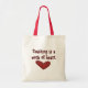 Bolsa de tote para um professor favorito com texto e gráficos cardíacos que proclama "Ensinar é uma obra de coração." Bonito presente de apreciação de professores no final de um ano escolar ou a qualquer momento. Criado com a clipart licenciada adquirida por Alice Smith da Clipart4Resale.