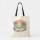 Uma mulher carregar um saco de tota de cor clara com um gráfico de estilo vintage de uma cena de praia por pôr do sol, completo com palmeiras, uma rede e sandálias, e o texto "Escape de Praia" abaixo.