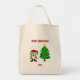Aqui vocês podem admirar um dos desenhos de Natal, eu chamo, "FrankenCheese de Natal", FrankenCheese vestido de Papai noel, com uma árvore de Natal decorada, o texto diz, "Feliz Natal". Agora você pode pedir, "FrankenCheese de Natal", nesta bolsa de mercearia para desejar a alguém um Feliz Natal."