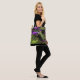 Saco de tote com uma linda fêmea de beija-flor-garganta, sentada em flores roxas. Foto de Karla Chrast.