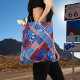 Um saco de designer moderno com um padrão de retalhamento de jeans azuis com padrões de designer vermelho e branco. Você pode personalizar, dimensionar ou excluir o texto do monograma, bem como dimensionar ou girar o padrão, se quiser.