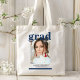 A Festa de formatura de fotos Elegante Modern Script Tote Bag apresenta sua foto favorita com o simples texto azul "Formando (ano)" e seu nome e detalhes personalizados de graduação na frente. Perfeito para o formando como presente de graduação ou decoração festa de formatura. Criado por ©2023 Evco Studio www.zazzle.com/store/evcostudio