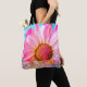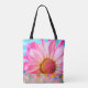 Uma margarida rosa brilhante contra um fundo azul brilhante. A parte inferior do bolsa é decorada com um padrão de bolinhas de cor de água.