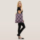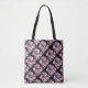 Esse gráfico floral é exibido em um padrão de diamante, com aglomerados de flores, pétalas e folhas, em mudo, de cores de; rosa, fuschia, lavanda, mauve, verde e branco contra um pano de fundo de preto.