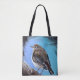Este saco acessível caracteriza um tordo de eremita em um fundo azul. A imagem é de minha própria pintura original.