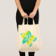 Este hibiscus brincalhão decora esta sacola que é grande para o trabalho, a compra ou um dia na praia. Mostrado aqui na bolsa de compra no preto. Este design vem em diversos colorways.