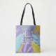 Fundo de lavanda com folhagem tropical em cores azuis, cor-de-rosa e limão com script personalizado "olá verão". Saco perfeito para suas viagens de verão e pode segurar tudo que você precisa para um dia na praia ou comprar pura.