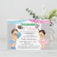 Touchdowns ou sexo de tutus revelam convites para chuveiros de bebês com adoráveis cabelos escuros, menino e menina em um fundo de cópula de cinza bonito com faixas cor-de-rosa e azul. Este touchdowns bonitos ou o convite para chá de fraldas de tutus é facilmente personalizado para o seu evento simplesmente adicionando os seus detalhes.