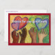 A mensagem do cartão-postal observa: "Obrigado pelo seu excelente trabalho." Mãos multirraciais alcançam corações coloridos em forma de arco-íris como uma celebração da diversidade, equidade e inclusão. A arte foi feita usando aquarela seguida de pastéis no papel.