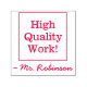 Este design de carimbo positivo apresenta a mensagem motivacional "Trabalho de alta qualidade!" e o nome de um professor personalizado. Ele poderia ser usado por um professor de escola, educador, instrutor ou orientador ao formando trabalho estudantil, para indicar que um aluno fez um trabalho excepcional.
