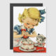 Little Girl and the Cake - Um cartão de aniversário retrô do 50 com uma garotinha decorando um bolo com seu gatinho.
