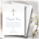 Obrigado seus entes queridos pela sua presença e presentes pensativos no dia especial do seu filho com nosso belo Batismo Obrigado Cartões. Apresentando uma cruz de ouro sobre um delicado impressão de efeito de local sobre um fundo branco e uma elegante inscrição azul empoeirada personalizável, estas cartas são a maneira perfeita de expressar sua gratidão de uma forma na moda e sofisticada. O impressão de efeito de local de borda superior em um fundo branco adiciona um toque de elegância e é complementado pela personalizável inscrição azul empoeirada, fazer cada placa uma expressão exclusiva e personalizada de sua apreciação. O reverso do cartão também está em um belo azul empoeirado para adicionar um toque de cor e melhorar o design geral. Com a opção de usar a saudação fornecida ou personalizar com a sua, essas cartas fornecem um toque pessoal que fará com que seus entes queridos se sintam apreciados e especiais.