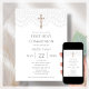 Celebre a Primeira Comunhão do seu filho em estilo com nossos elegantes e eternos convites da Primeira Comunhão, com uma delicada fronteira de impressão de renda branca e um espantoso crucifixo de efeito ouro em fundo branco. Estes convites são perfeitos para comemorar este marco especial na jornada religiosa do seu filho. Nossos convites foram projetados para serem fáceis de personalizar, para que você possa adicionar seu próprio texto e detalhes sem esforço. Além disso, eles estão disponíveis para download instantâneo, fazer fácil para você impressão-los e enviá-los aos seus convidados sem nenhum atraso.