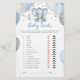 Este bebê traça o cartão de chá com elefante de bebê azul e cinza com balões e confete. Você pode personalizar as perguntas do jogo clicando no botão "personalizar".