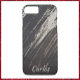 Capa de telefone elegante e moderna com uma vibração masculina. Abstrato pinceladas de tinta em preto e marrom sobre fundo de madeira. Personalize com seu nome.