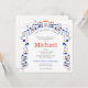 Convite da Tradição Bar Mitzvah, rodeado pela fronteira de Jerusalém em ouro e azul, juntamente com a frase se eu me esquecer de Jerusalém, que minha mão direita esqueça sua astúcia em Hebraico, אם אשכחך ירושלים תשכח ימיני