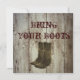 Este convite de casamento rústico é perfeito para qualquer casamento no interior oeste. Apresenta um fundo de madeira de celeiro impresso no país rústico em ambos os lados do convite. O convite tem um design de renda impresso na lateral do convite e duas botas de cowboy. Um dos lados do convite diz "Traga suas botas" e o outro lado tem os detalhes do convite de casamento. As botas de madeira, renda e cowboy são apenas designs impressos. Não é madeira real ou renda real.