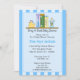 Convite ao Chá de fraldas Azul com uma prateleira de livros, uma garrafa de bebê e um pato de borracha. Adicione os detalhes de sua festa para um tipo de convite.rabiscos deliciosos