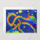Um arco-íris colorido está deixando o globo e desaparece no espaço azul, transformando-se em astros espaciais e estrelas.