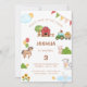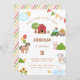 É hora da festa na fazenda! Convide seus jovens hóspedes com este belo convite de aniversário com tema de fazenda, com um celeiro, balões coloridos, beliche e ilustrações adoráveis de um cavalo, vaca, porco, pato e galo. Perfeito para um menino ou menina que ama animais, este convite pode ser personalizado com seu próprio texto