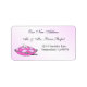 Uma etiqueta de novo endereço personalizada com script e letras padrão e arte de vintage do chinelo de vidro da Cinderella em um travesseiro rosa, em um fundo rosa e branco. Personalize-o para alterar fontes ou tamanhos.