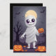 Termine o Halloween com diversão com nosso cartão-presente "Travessuras de Múmia"! Este design assustador, mas divertido, apresenta uma múmia de desenho animado envolta em bandagens rasgadas, com um sorriso amigável e travesso espiando por trás. Contra um cenário de um cemitério escuro e enevoado com uma lua cheia lançando um brilho sinistro, este cartão captura o espírito festivo do Halloween.