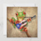 Este design do artista Jeff Bartels apresenta um pequeno sapo de árvore verde segurando uma guitarra acústica riscada e vestida. A bandeira de Porto Rico é pintada no velho violão dando-lhe um olhar patriótico. O adorável músico do sapo da árvore está sentado em um pequeno galho e está olhando para frente com seus grandes olhos vermelhos. A cabeça e o corpo pequenos, além dos detalhes na pele e no violão, criam uma bela combinação de desenho animado e aparência realista. Este padrão único e patriótico guitarrista sapo de árvore porto-riquenha é perfeito para todos os amantes de animais e música.