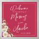 O poster de boas-vindas do casamento da Trendy mostra o canto branco da cor d'água do fundo Viva Magenta com blocos de texto personalizáveis brancos em fontes modernas