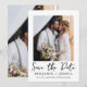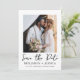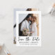 Este casamento tendencioso salve o cartão de anúncio de data com duas fotos e preto chic salve o script de data lettered em um fundo branco limpo. O verso é uma foto de cheio. Avise aos hóspedes que você os convidará para o próximo casamento com esta simples foto minimalista, salve o cartão de data (os convites clássicos de coordenação de casamento podem ser enviados posteriormente e estão disponíveis para serem comprados separadamente).