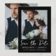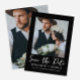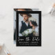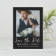 Este casamento tendencioso salve o cartão de anúncio de data com duas fotos e branco chic salve o roteiro de data lettered em um plano de fundo preto elegante. O verso é uma foto de cheio. Avise aos hóspedes que você os convidará para o próximo casamento com esta simples foto minimalista, salve o cartão de data (os convites clássicos de coordenação de casamento podem ser enviados posteriormente e estão disponíveis para serem comprados separadamente).