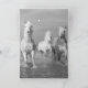 Três cavalos brancos de Camargue correm pelo pântano em Camargue, França, esmagando a água. Há outra imagem de três cavalos dentro do cartão. Ambas as imagens são de Carol Walker.