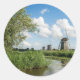 Um autocolante fotográfico redondo de três moinhos de vento ao longo de um canal com barcos e sementes sob um céu azul com nuvens inchadas criando uma cena pacífica no campo holandês de Leidschendam, Países Baixos.