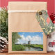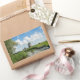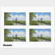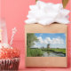 Um autocolante de fotos retangular de três moinhos de vento ao longo de um canal com barcos e sementes sob um céu azul com nuvens inchadas criando uma cena pacífica no campo holandês de Leidschendam, Países Baixos.