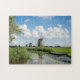 Quebra-cabeça de serra de vaivém de três moinhos de vento ao longo de um canal com barcos e juncos sob um céu azul com as nuvens inchado que criam uma cena calma no campo holandês de Leidschendam, os Países Baixos.