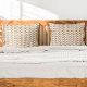 Este travesseiro colorido apresenta um padrão geométrico fofo com minúsculos triângulos em tons verdes e alaranjados autóctones. Excelente para o outono.