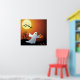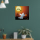 Um Fantasma do Dia das Bruxas indo para Trick ou Tratando com um balde de abóbora na mão. Morcegos voadores, lua, árvores secas e folhas no fundo.