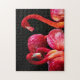 Quebra-cabeça de jogo mostrado com uma impressão de fotos de lindas aves rosadas flamingas. Personalize este item ou comprar como está. Imagem do stock