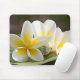 Mouse pad mostrado com uma impressão de fotos de lindas flores tropicais de plumeria. Personalize este item ou comprar como está. Imagem do stock