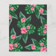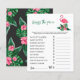 O design de convite para chá de fraldas apresenta flamingo cor-de-rosa com frondes verdes de palma e flores de hibisco tropicais. "Aloha Baby". Um padrão floral tropical com cor preta de fundo se veste na parte de trás do cartão.