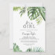 Este tropical selvagem é um convite de chá de fraldas feminino é perfeito para um chá de fraldas de tema de praia. A design apresenta um conjunto exótico de folhas de palmeiras de banana-d'água verde, samambaias, folhagem, plantas botânicas e verde para uma sensação tropical de verão.