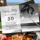 Sépia, convite de festas surpresa da cena da praia para a celebração do marco. Um barco de madeira fica em uma praia deserta com palmeiras, ondas oceânicas e céu como pano de fundo para seu costume. Use o título da festa surpresa, ou mude-o para "Festa de aniversário" ou qualquer coisa. A idade está em grandes números e o modelo de nome pode acomodar o nome do primeiro ou do cheio. Incluir rsvp e outras informações à direita do texto principal. O reverso é marrom-escuro como sépia.