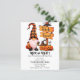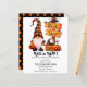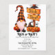 Trick ou Tratat Invitation para toda a família que possui um gnomo bonito vestindo uma lâmpada feita de uma abóbora e uma ilustração do Sinal de Trick and Tratat de madeira. Você pode personalizar este Convite com seus detalhes.