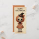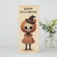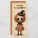 Aqui está um cartão de Dia das Bruxas bonitinho com uma menina assustadora ilustração com um crânio/cabeça de abóbora e um bonitinho chapéu de bruxa. As cores são laranja e marrom e o cartão tem um velho tempo, fofo e assustador nele. É uma carta divertida para usar como um cartão de saudação de Halloween, um convite de época assustadora ou para incluir com um presente.