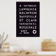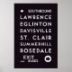 Poster do estilo de rollsign da Comissão de Trânsito de Toronto. Os recursos param ao longo da linha do metrô Yonge. Lista de estações em poster: Sinalização "Sul", Lawrence, Eglinton, Davisville, Rua. Clair, Summerhill, Rosedale, Sinalização "Sair e Ônibus".