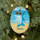 Há uma cena na praia com o oceano. No oceano está um tubarão. Ele está na barbatana e vestindo óculos de sol laranja. Na areia da praia você pode personalizar para torná-lo especial com um nome! Vejam nossos muitos outros designs!