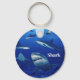 Chaveiro é mostrado com uma impressão de foto de tubarões no mar profundo. Personalize este item ou comprar como está. Imagem do stock