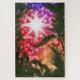 Um começo brilhante pendurado em uma árvore de Natal contra um fundo brilhante de um livro em todas as cores do arco-íris.