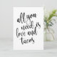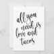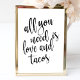 Um elegante sinal de casamento de ponta, apresenta o texto "Tudo o que você precisa é amor e tacos" em uma fonte de letra extrovertida, a textura da pincelada adiciona um sentimento espontâneo e divertido. A cor do fundo pode ser personalizada de acordo com as suas necessidades e preferências, por favor entre em contato comigo se tiver algum pedido especial.