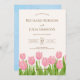 Esse belo e elegante convite é decorado com ilustrações com o tema das tulipas cor-de-rosa-pinceladas. Os lados frontal e traseiro são cuidadosamente projetados, e as cores rosa e verde são harmoniosamente misturadas. Ele apresenta caligrafia, sans serif, fontes serif. Sinta-se livre para modificá-lo e usá-lo.